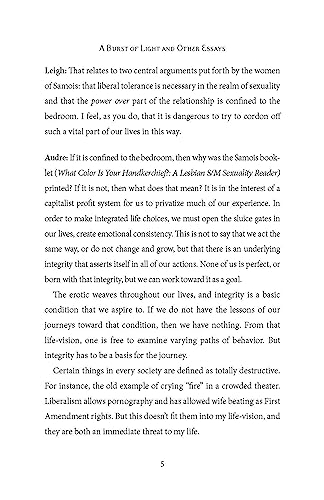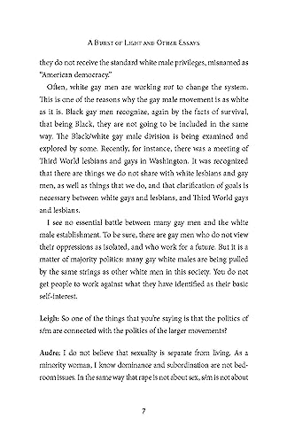 Those who practice and encourage social justice activism frequently quote her exhortation, “Caring for myself is not self-indulgence, it is self-preservation, and that is an act of political warfare.” In addition to the journal entries of “A Burst of Light: Living with Cancer,” this edition includes an interview, “Sadomasochism: Not About Condemnation,” and three essays, “I Am Your Sister: Black Women Organizing Across Sexualities,” “Apartheid U.S.A.,” and “Turning the Beat Around: Lesbian Parenting 1986,” as well as a new Foreword by Sonia Sanchez.