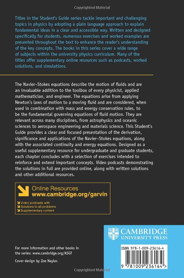 This Student’s Guide provides a clear and focused explanation of the Navier-Stokes equations of fluid motion. Designed as a supplementary resource for undergraduate and graduate students, each chapter includes a selection of exercises. Video podcasts demonstrating the solutions are provided online, along with written solutions and other resources.