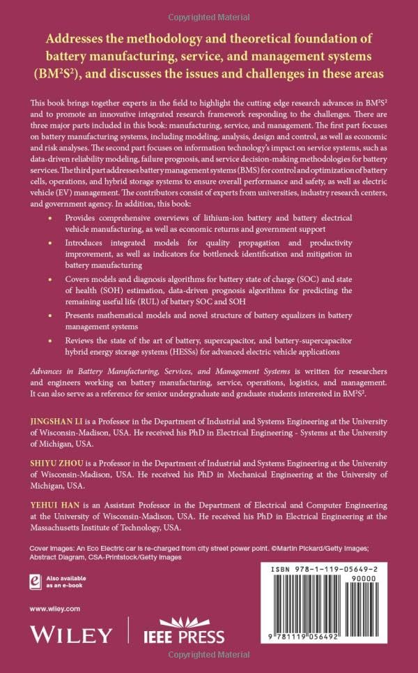Advances in Battery Manufacturing, Services, and Management Systems is written for researchers and engineers working on battery manufacturing, service, operations, logistics, and management. It can also serve as a reference for senior undergraduate and graduate students interested in BM2S2.