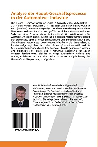 Die Haupt- Geschäftsprozesse eines österreichischen Automotive – Zulieferers werden analysiert (IST- Prozesse) und deren Überführung in Soll- (Optimal) Prozesse aufgezeigt. Da diese Betrachtung durch einen Newcomer in dieser Branche durchgeführt wird, kann eine vorurteilslose Sicht auf diese Prozesse (keine Betriebsblindheit) erzielt werden. Ein wichtiges Anliegen dieses Buches ist die praxiskonforme Umsetzbarkeit der Ergebnisse, speziell unter Einbeziehung und Berücksichtigung der, diese Prozess- Änderungen betreffenden, Mitarbeiter des Unternehmens. Es wird aufgezeigt, dass durch die richtige Informationspolitik und die Meinungseinbeziehung dieser Arbeitnehmer, Ängste genommen werden und gleichzeitig die aktive und konstruktive Gestaltung der neuen Prozesse forciert wird. Ziel ist es, Wege aufzuzeigen, welche eine rasche, effiziente und von allen Seiten unterstütze Optimierung der Haupt- Geschäftsprozesse, ermöglichen.