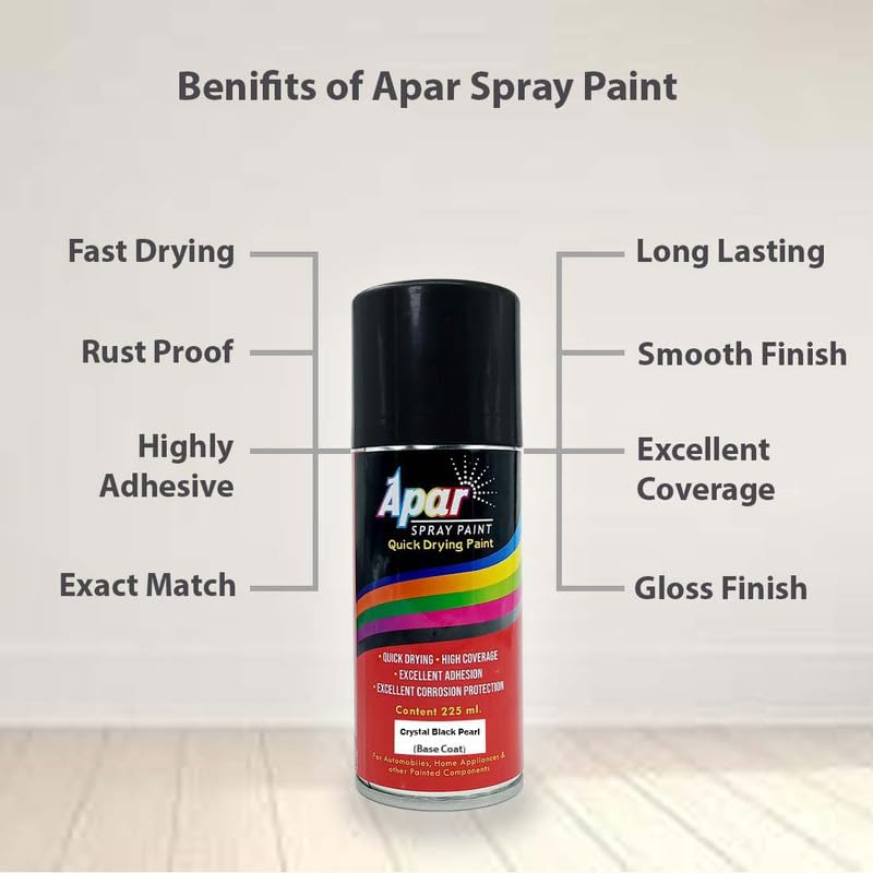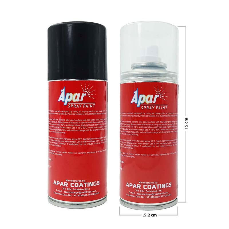 Crystal Black Pearl -Base Coat and GLOSS CLEAR -Top Coat , is Combo 2-pack system, based on Super Quality Polyurethane (PU) Binder, It is Superb Metallic spray paint for Honda cars like Brio, Civic, City, Jazz, Mobilio, Accord, CR-V and Civic Type R etc. Apar paints are excellent for general uses, its coat durable against heat and prevents the metal surface from rust. It’s Fast-drying, long lasting, vibrant, High Gloss, Excellent Coverage, Corrosion Resistance, highly adhesive on wood, plastics and metal surfaces, With shades and types of colors invented specifically to coat perfectly and refinishing. How To Apply: 1- Clean the surface area where you want to use the spray paint for any water, oil, grease, durt, rust etc, If Surface is rusty or non uniform, use 800 No. grit sandpaper to Smooth the Surface. To get better anti-rust performance on metal surface, apply Apar primer surfacer Spray paint as a base coat. 2- Shake the can well. Gently press the top of the spray nozzle and direct to the target area at 6-7 Inches distance, spray the target area in stroking motion every 2-3 minutes for 2 to 3 coating till you get the desired look. Keep repeating for several times and get better effect. After use, invert the Can and press the nozzle without fail to Clean spray button, 3-Remember Use HONDA Crystal Black Pearl – base coat first, and only after completion and drying (3-5 minutes) of this step apply GLOSS CLEAR – Top Coat over the base coat applied area.