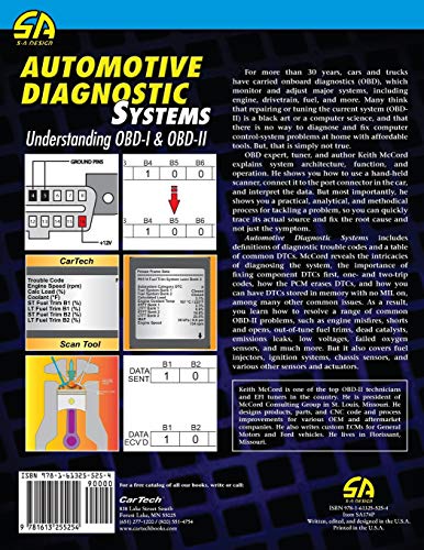 Keith McCord recounts the history of automotive onboard diagnostic systems and creation of the rudimentary OBD I systems and the development as well as the evolution of OBD II. Currently, OBD-II (OnBoard Diagnostic II) is the standard of the industry, and this book provides a thorough explanation of this system. It details its main features, capabilities, and characteristics. It shows how to access the port connector on the car, the serial data protocols, and what the serial data means. To understand the diagnostic codes, the numbering system is defined and the table of common DTCs is shown. But most importantly, McCord provides a thorough process for trouble shooting problems, tracing a problem to its root, explaining why DTCs may not lead to the source of the underlying problem, and ultimately resolving the problem.
