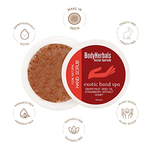 BodyHerbals Hand Scrub 1 Minute Manicure with Goodness of Grape Fruit Seed Oil, Strawberry Extract & Honey | Exfoliating Scrub to Remove Dead Skin & Tan from Hands & Elbows | Scrub for Youthful Hand for Women and Men | 100 gm Paraben and SLS Free