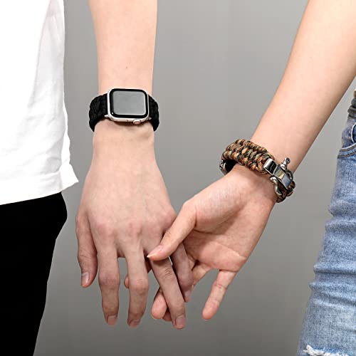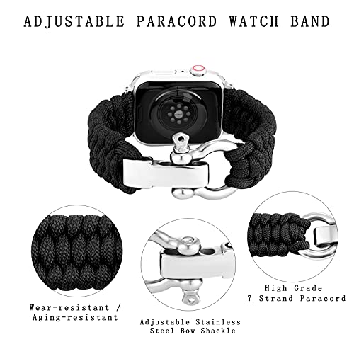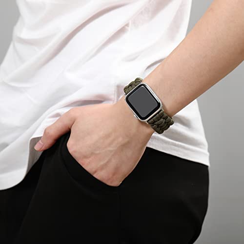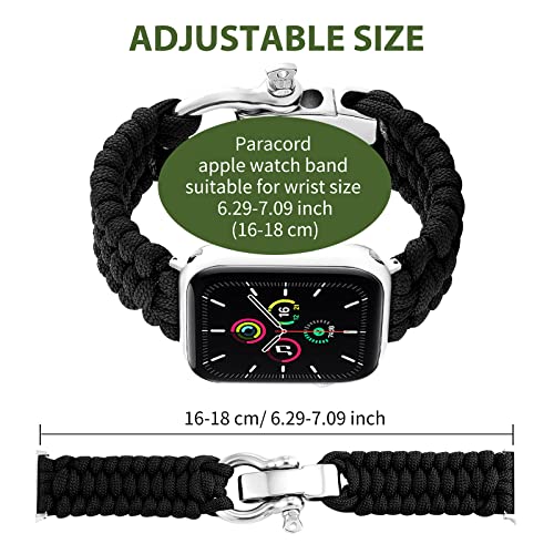 CHARMINGO 550 Paracord Band Compatible with Apple Watch Band 38mm/40mm/41mm 42mm/44mm/45mm, Outdoor Sports Adjustable Lifesaving Wristband for iWatch Series 7/6/5/4/3/2/1 SE, Green/Black/Camo Specification: Material: 550 Paracord and stainless steel Recommend Wrist Size: 16-18cm/6.29-7.09inch Features: BEST SURVIVAL ASSISTANT: Our lifesaving wristband featured with seven inner-strand 550 lb. paracord, can be disassembled as a rope strong pull up to 140kg. Best for creating shelters, securing items, clothes lines, emergency snares, tourniquets, etc. p>ADJUSTABLE SIZE (16-18cm/6.29-7.09inch): The outdoor sports band comes with an adjustable shackle which is made of high grade stainless steel. 3 holes allowing you to adjust your watch band for the perfect fit, fit for 6.29-7.09inch wrist. Packaging included:1 X Paracord Apple Watch Band 1 X White Velvet Bag