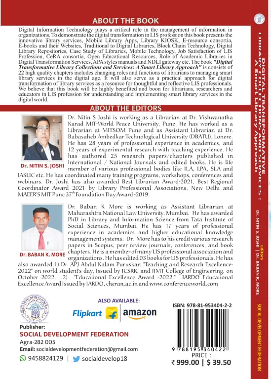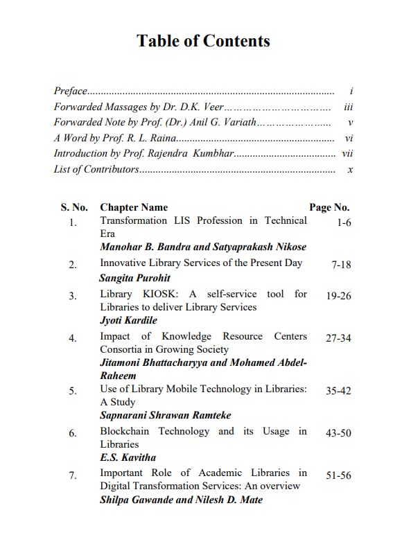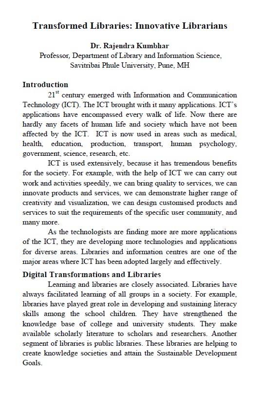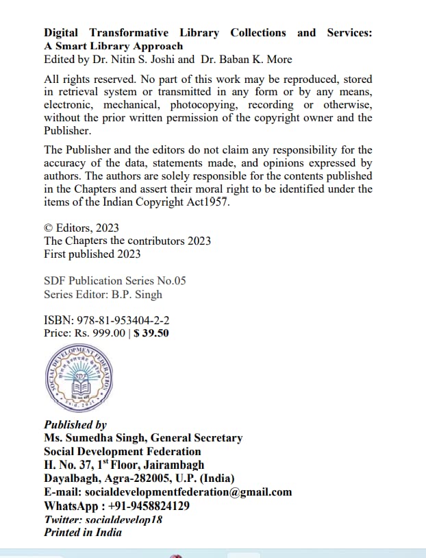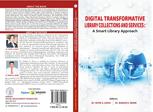 Digital Information technology plays a critical role in the management of information in organizations. To demonstrate the digital transformation in LIS profession this book presents the innovative library services, Mobile Library Apps, Library KIOSK, E-resource consortia, e-books and their websites, traditional to digital libraries, block chain technology, Digital library repositories, case study of libraries, mobile technology, job satisfaction of LIS profession, CeRA consortia, open educational resources, role of academic libraries in digital transformation services, APA styles manuals and NDLI gateway etc. The book “Digital Transformative Library Collections and Services: A Smart Library Approach” is consists of 22 high quality chapters includes changing roles and functions of librarians to managing smart library services in the digital age. It will also serve as a practical approach for digital transformation of library services as a resource for thoughtful and reflective LIS professionals. We believe that this book will be highly benefited and boon for librarians, researchers and educators in LIS profession for understanding and implementing smart library services in the digital world
