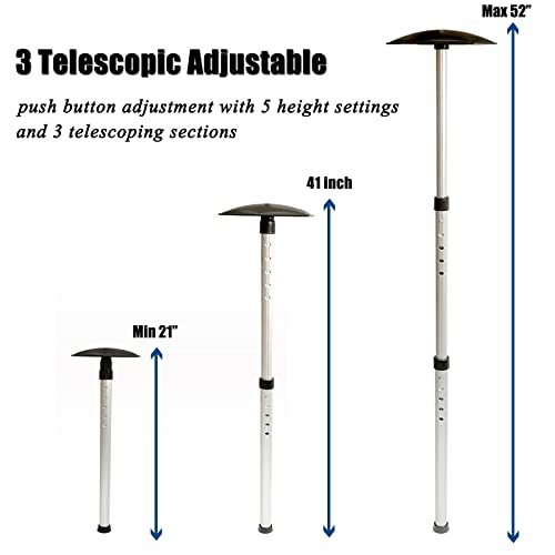 Easy to use, push button adjustment with 5 height settings and 3 telescoping sections.