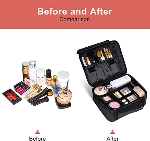 🌠 UNIQUE AND EXQUISITE DESIGN ?Main compartment includes 6 adjustable EVA dividers,You can design yourself internal compartments by the adjustable padded dividers and separate and organize all of your cosmetics, makeup tools, toiletry jewelry;Makeup brushes holder with plastic cover, not afraid of the residual cosmetics on the brush.