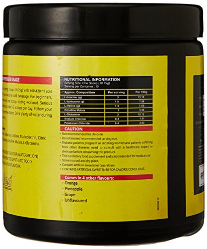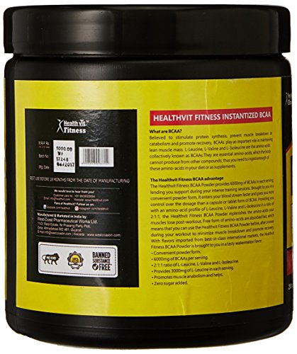BCAA believed to stimulate protein synthesis, prevent muscle breakdown or catabolism and promote recovery, branched chain amino acids or BCAAS play an important role in maintaining lean muscle mass. L leucine, l valine and l isoleucine are the amino acids collectively known as BCAAS. They are essential amino acids, which the body cannot produce from other compounds thus you need to ingest enough of these amino acids in your diet or as supplements. The Healthvit fitness BCAA advantage the heaithvit fitness BCAA powder provides 6000mg of BCAAS in each serving lending you support during your intense training sessions. Brought to you in a convenient powder form, it enters your blood stream faster and gives you more control over the dosage than a capsule or tablet form of BCAA. Providing you with an amino acid profile of l leucine, l valine and l isoleucine in a ratio of 2:1:1, the heaithvit fitness BCAA powder replenishes the amino acids your muscles lose post workout. Free form of amino acids are absorbed fast, which means that you can use the heaithvit fitness BCAA powder before, after or even during your workout to minimize muscle breakdown and promote recovery. With flavours imported from best in class international markets, the heaithvit fitness BCAA powder is brought to you in a tasty watermelon flavour.