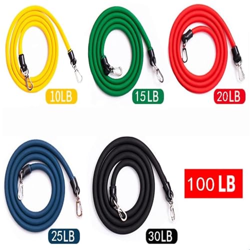 :5 different colored bands – Yellow band (10lbs), Blue band (15lbs), Red band (20lbs), Green band (25lbs) and a Black band (30lbs); use them alone or combine any of them to increase intensity; combined maximum resistance of 100 lbs.