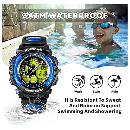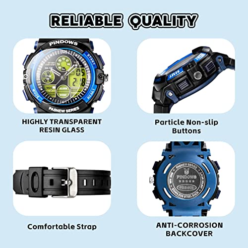 【High Quality Materials】Pindows waterproof watch for kids adopts High quality PU strap, soft and comfortable,watch strap can bend freely, which is breathable, perspiring and environmental friendly.high-hardness mineral tempered glass mirror, strong transparency, abrasion resistance and scratch resistance, 304 stainless steel face ring, sturdy and sturdy casing, very reliable appearance.