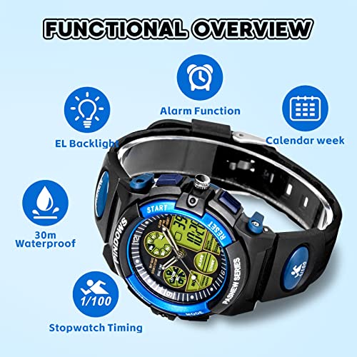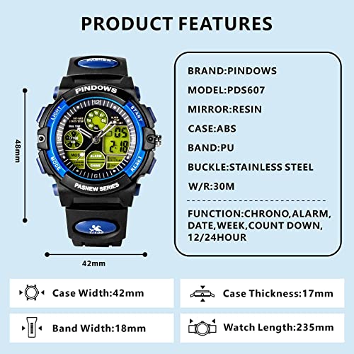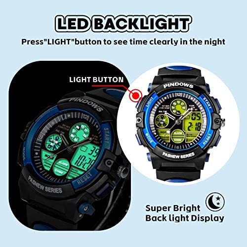 【Multi-Functional Digital Watch】Pindows watch for kids has Digital display, Date, Week, Alarm, Stopwatch, Hourly Chime, 12/24h format, LED back light, 30m Waterproof, This digital sport watch is perfect fit with all kinds of sports and it’s really suitable for boys girls outdoor play.