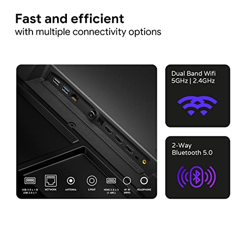 Connectivity: Dual band Wifi | 2 way Bluetooth | 3 HDMI 2.1 to connect personal computer, laptop, set top box, Blu-ray speakers or a gaming console | USB ports 2.0 x 1, 3.0 x 1 to connect hard drives or other USB device