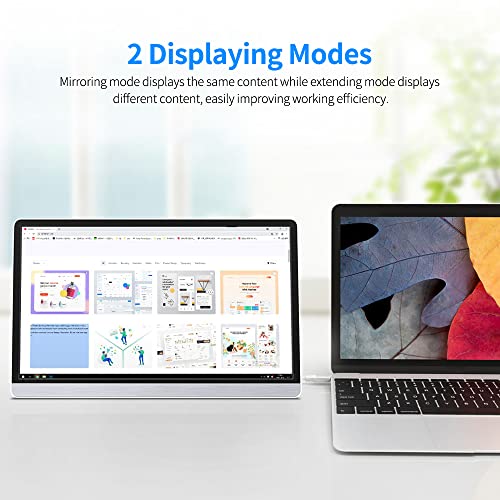 as supports HDR, delivering an immersive viewing experience. And with mini HD and type-C ports, it is compatible with most devices. Besides, comes with hidden stand at its back, free your hand when used. Feature: 1080P IPS Screen It offers resolution up to 1920*1080, IPS 178° wide viewing angle screen, 1000:1 contrast ratio and 100% sRGB color gamut, delivering an immersive viewing experience. Wide Compatibility With mini HD and type-C ports, it is compatible with most devices like laptop, phone, PC, game console, etc. A great choice to extend your screen for business trip, travel, or home entertainment. Monitor Stand It comes with a hidden stand at its back which can hold the monitor in vertical and horizontal direction. Support HDR This technology ensures every moment of a video displayed at its most suitable values that it can achieve. 2 Displaying Modes Mirroring mode displays the same content while extending mode displays different content, easily improving working efficiency. Specification: Screen size: 16.1in Resolution: 1920* 1080 Panel type: IPS Brightness: 300cd/m2 Contrast ratio: 1000:1 Pixel pitch: 0.1617* 0.1617mm [137PPI] Aspect ratio: 16:9 Viewing angle: 89/89/89/89 (Typ.) (CR≥10) Refresh rate: 60Hz Color gamut: 100% sRGB Color: 16.7M Speaker: Support Interface: Mini HD port: 2.0HD signal input/ Transmit audio & video Type-C ports: Power supply/ Transmit audio & video Headset port: 3.5mm AUX port Button: Multifunctional gear Item size: 369* 230* 5mm/ 14.53* 9.06* 0.2in Item weight: 857.8g/ 30.26oz Packing list: 1 * 16.1in Monitor 1 * Type-C cable 1 * Type-C to USB cable 1 * Mini HD to HD cable 1 * Power Adapter 1 * User manual