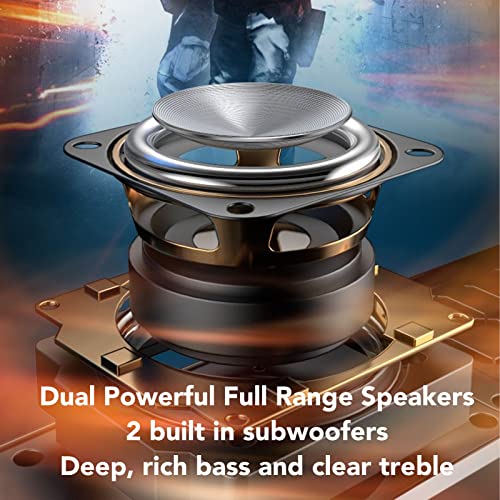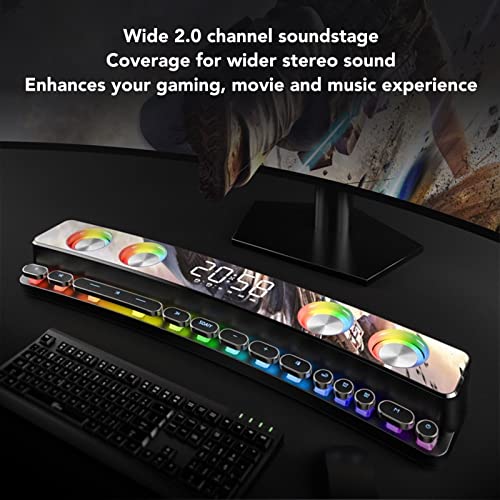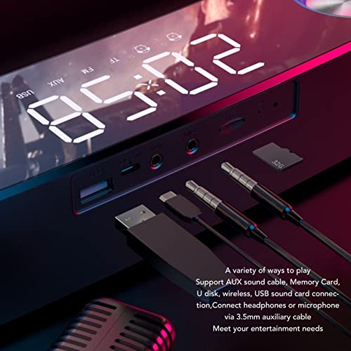 1. [Wide Compatibility] 19 inch slim computer speaker with and dynamic RGB light compatibility, stylish curved shape and mechanical button combination for desktop PC gaming monitors, projectors, laptops, tablets, phones. 2. [HiFi Stereo] Features dual powerful full range speakers and 2 built in subwoofers to deliver room filling sound with deep, rich bass and clear treble. Wide 2.0 channel soundstage coverage produces wider stereo sound to enhance your gaming, movie and music experience. 3. [Wireless And Wired Connectivity] This computer speaker connects to your device via 5.0 chip or to your desktop computer via USB cable. You can also read music via Memory Card, MF memory card or connect headphones or microphone via 3.5mm auxiliary cable. 4. [Dynamic RGB Light] The PC gaming speaker is designed with dynamic RGB light effects, the buttons and speaker are designed with LED lights, and the color of the lights will change with the music. You can also use the light adjustment buttons to adjust to your preference or mood. 5. [Multifunctional] Not only a small bar speaker, but also a 12, 24 hour clock with dual alarms, FM radio, thermometer for bedroom, kitchen. Intuitive HD display and mechanical buttons are easy to use. Built in battery for USB power, also suitable for outdoor or travel use. 6. [Gift Choice] bar speaker with FM radio function allows you to listen to news, music, radio programs. HiFi surround sound quality, stylish design and cool RGB light combination make this product an ideal family gift, Mother’s Day family or. Specification: Item Type: BT Computer Speaker Material: ABS Built in Battery: Lithium Battery 360mah BT Version: V5.0 BT Reception Distance: Approx. 10m/32.8ft Separation Degree: ≥60db SNR: ≥70db Distortion: ≤10% Frequency Response Range: 80HZ- 20KH Speaker Impedance: 4Ω x 2 Speaker Power: 6W x 2 Memory Card: Maximum Support 32G (Not Included) How to