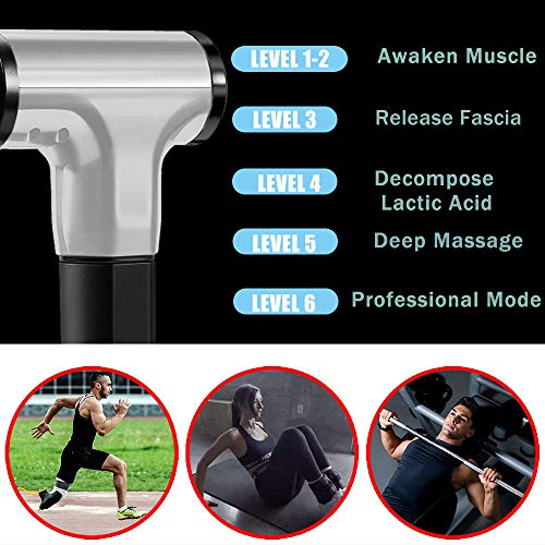 「💪6 SPEED LEVEL」With 6 adjustable speeds in this electric massage gun, the maximum speed is up to 3600 percussions per minute, it can help you relieve muscle stiffness, tightness, and activates the nervous system and muscles. it is very suitable Whether relaxing muscles after exercise or daily body massage