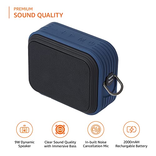 Amazon Basics Bluetooth Speaker, IPX5 Waterproof, TWS Function, 9W, Powerful Bass, BT 5.0, Up to 15hrs Playtime*, microSD Card Slot, AUX Input, USB Support and in-Built Noise Cancelling Mic (Blue)