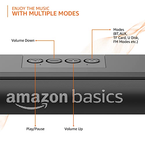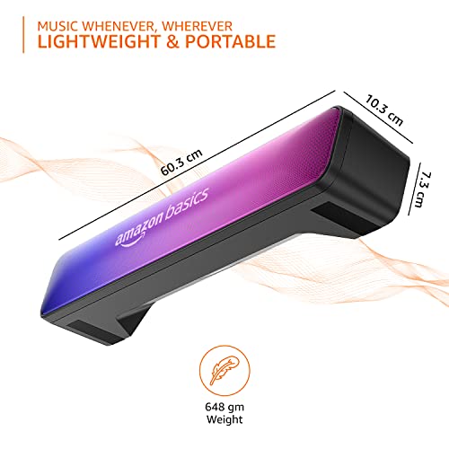 Introducing the Amazon Basics Wireless Soundbar. This 16W soundbar is ideal for amplifying sound output from PCs, phones, laptops, TVs, and monitors. Owing to its sleek design, the product fits in your home without taking up much space. Its lightweight quality makes it easy to move as well. It is equipped with RGB LED lights which enhance your viewing and gaming experiences. The control button on the sound bar enables you to easily turn the lights on or off. Moreover, the bar comes with media and volume buttons for easy sound management. This soundbar can be connected with Bluetooth devices, 3.5 mm AUX, Micro SD cards, and USB flash drives, making it highly compatible. Enhance gaming, watching movies, and listening to music with this product from Amazon Basics.