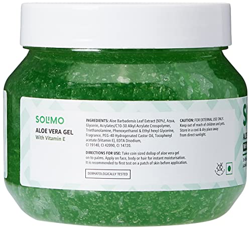 Pollution, cold weather and harmful UV rays wreak havoc on the skin. Enrich your skin with the soothing and healing goodness of Solimo 90% Pure Aloe Vera Gel! Loaded 90% with pure natural aloe vera extracts, it leaves the skin feeling fresh and rejuvenated with its cooling and moisturizing effect. Make it a part of your daily morning routine as regular use helps the skin stay hydrated. You can also use the gel as a conditioner for healthier hair. Or apply it to soothe and heal sunburnt areas. Packed with vitamin E, this aloe vera gel keeps your skin protected from pollutants and damage. To ensure safe usage, it has been made free from alcohol, silicone, mineral oil and paraben. It is available in a PET transparent jar and easy to apply without leaving a greasy feel behind. Take a coin-sized dollop of this green transparent gel and gently massage into skin or hair for instant moisturisation. It is recommended to first test on a patch of skin before application.