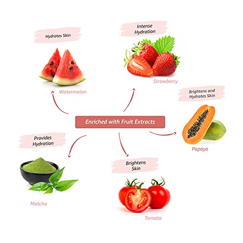 Papaya and Strawberry help brighten and hydrate skin, Tomato helps brighten skin, Matcha and Watermelon provide intense hydration