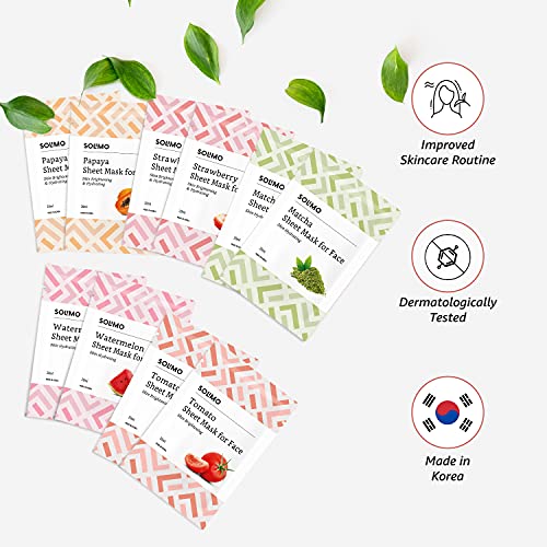 Amazon Brand – Solimo Face Sheet Mask, Pack of 10 (2 Packs Each of Papaya, Strawberry, Matcha, Watermelon, Tomato)