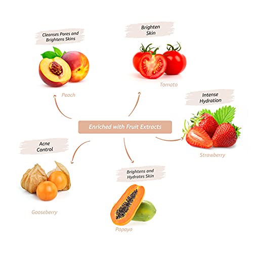 Papaya and strawberry helps brighten and hydrate skin, Peach helps cleanse pores and brighten skin, Tomato brightens and Banana provides intense moisturisation