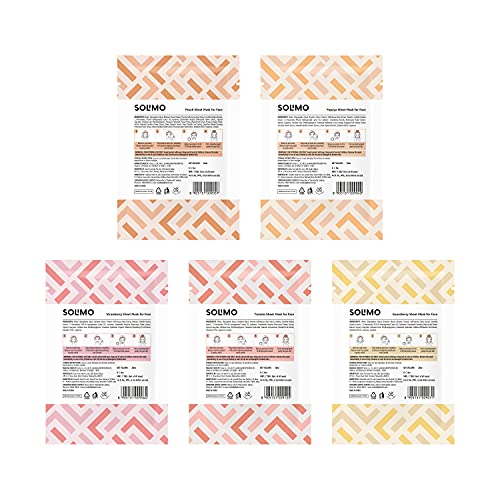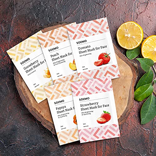 Package Contents:- 5 Variants of Solimo Face sheet Masks- Papaya, Peach, Strawberry, Gooseberry, Tomato