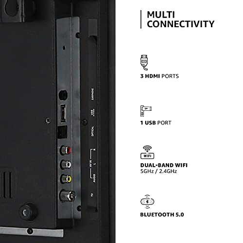 Connectivity: Dual band Wi-Fi (2.4 GHz/ 5 GHz) for easy connectivity and uninterrupted streaming | 2 way Bluetooth 5.0 for wireless connectivity | 3 HDMI ports with ARC support to connect laptops, set top box, Blu-Ray players and gaming consoles | 1 USB port to plug in hard drives and other USB powered devices | IR Port to control connected devices like Soundbars and Receivers | Optical audio jack | 3.5mm earphone jack
