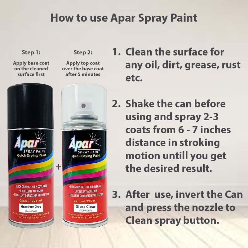 Grandeur Grey -Base Coat and GLOSS CLEAR-Top Coat , is Combo 2-pack system, based on Super Quality Polyurethane (PU) Binder, It is Superb Metallic spray paint Especially developed for Maruti Brezza, Baleno,Ertiga,XL6 and Grand Vitara automotive Vehicles Touch-up / paint rework and scratch removing needs. Apar paints are excellent for general uses, its coat durable against heat and prevents the metal surface from rust. It’s Fast-drying, long lasting, vibrant, High Gloss, Excellent Coverage, Corrosion Resistance, highly adhesive on wood, plastics and metal surfaces, With shades and types of colors invented specifically to coat perfectly and refinishing. How To Apply: 1- Clean the surface area where you want to use the spray paint for any water, oil, grease, durt, rust etc, If Surface is rusty or non uniform, use 800 No. grit sandpaper to Smooth the Surface. To get better anti-rust performance on metal surface, apply Apar primer surfacer Spray paint as a base coat. 2- Shake the can well. Gently press the top of the spray nozzle and direct to the target area at 6-7 Inches distance, spray the target area in stroking motion every 2-3 minutes for 2 to 3 coating till you get the desired look. Keep repeating for several times and get better effect. After use, invert the Can and press the nozzle without fail to Clean spray button, 3-Remember Use Splendid Silver – base coat first, and only after completion and drying (3-5 minutes) of this step apply GLOSS CLEAR- Top Coat over the base coat applied area.