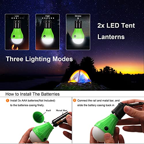Extra LED Camping Lights: Contained 2 Pcs Led Tent Lanterns with 3 modes. HIGH / LOW / Strobe. Use LED portable lantern to illuminate a large area, as (SOS)emergency lights or create flashing party air. Perfect camping gear fits different needs.