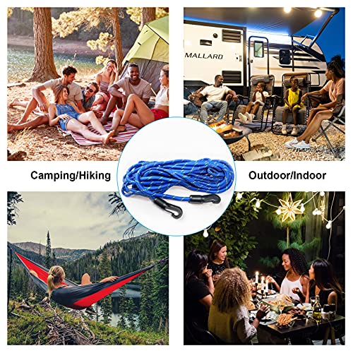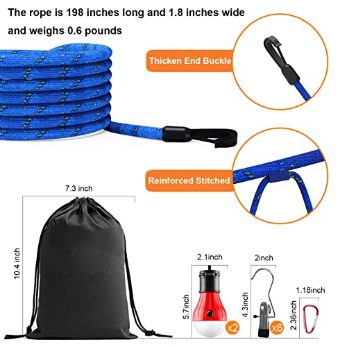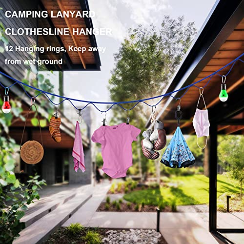 Multiple Loops & Hooks & Clothespins: The rope is 16 feet long. There are 12 loops on the primary band to prevent items from sliding to the center. Hang your gear from the 8 carabiner hooks and 4 clothing slips! It is equipped with 12 hooks, 6 clothes pins, and 2 LED camping bulbs for easy use at night.