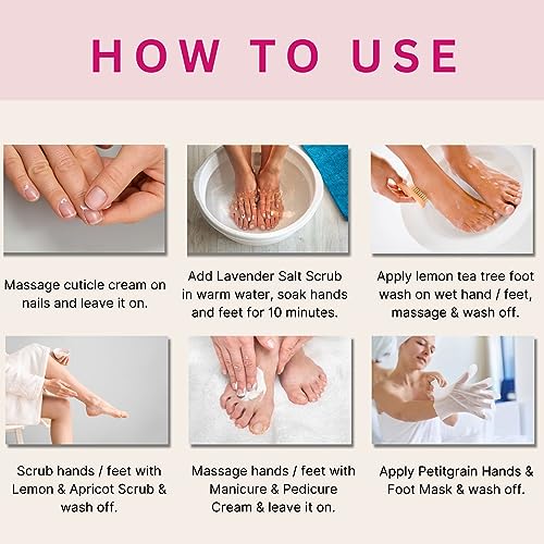 This manicure pedicure kit products contains cuticle cream 2G, lavender salt 5 g, lemon tea tree foot wash 5 ml, lemon and apricot scrub 7 g, manicure and pedicure cream 7 g, petit grain hand and foot mask 7 g