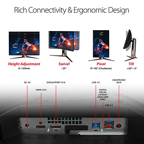 24.5-inch FHD (1920 x 1080) fast IPS gaming monitor with 360 Hz refresh rate designed for professional esports gamers NVIDIA G-SYNC processor provides smooth, tear-free gaming at refresh rates up to 360 Hz NVIDIA Reflex Latency Analyzer gives competitive gamers an accurate measurement of system latency for the first time. ASUS Fast IPS technology enables a 1 ms response time (GTG) for sharp gaming visuals with high frame rates. Include a ROG desk mount kit that can clamp to the edge of most any flat work surface. Full HD(1920 X 1080)@120Hz output on PS5 & Xbox Series X/S