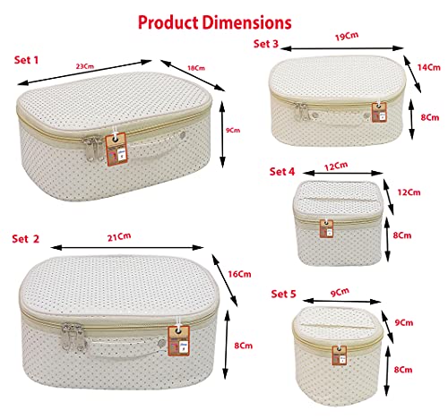 Dimensions of the 5 pcs are as follows Pack 1: 23 x 18 x 9 cm Pack 2: 21 x 16 x 8 cm Pack 3: 19 x 14 x 8 cm Pack 4: 12 x 12 x 8 cm Pack 5: 9 x 9 x 8 cm Very competitive rates zip closure can store enough items of different sizes best as indoor organizer and travel friendly a perfect gift durable, lasts for years