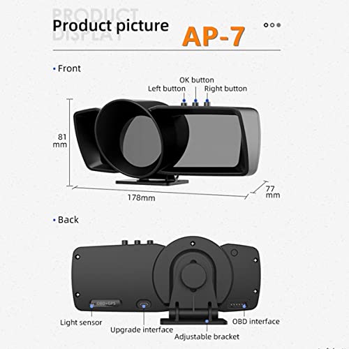 AUTO MT OBD2 GPS Smart Gauge HUD Display with Adjustable Bracket Alarm Light Clear Fault Code Speedometer OBD2 Meter Description: There are multiple supporting functions, including rotatable bracket providing 2 installation methods(center console installation or suction on the windshield), 3 super large LCD screen, three units of turbine pressure (PSI, 100KPA, and bar), new alarm functions(turbine pressure alarm, exhaust temperature alarm, oil temperature alarm, oil pressure alarm, fuel pressure alarm), etc. OBD2+GPS dual system can function together. The OBD2 mode can display more than 100 data streams, including speed, rotation speed, water temperature, voltage, fuel consumption, etc. The GPS mode also has many functions, such as speed, longitude, number of satellites, clock, single driving distance, compass, etc. Made of quality ABS and PC material, it is safe and durable to use. The length of the product is 17.8cm, the width is 8.1cm, and the height is 7.7cm. It can be used in all cars,vehicles and trucks in the market. Item Name: HUD Display Material:ABS,PC Support Operating System: OBD2+GPS Size:17.8cmx8.1cmx7.7cm/7.01inx3.19inx3.03in Notes: Due to the light and screen setting difference, the item’s color may be slightly different from the pictures. Please allow slight dimension differences due to different manual measurements. Package Includes: 1 X Host 1 X OBD2 Cable 1 X Magic Sticker 1 X English User Manual