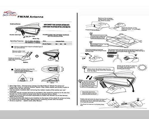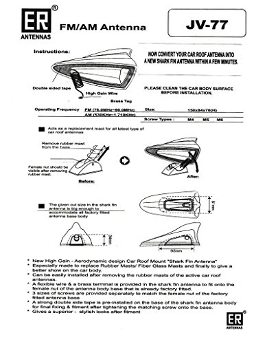 Can be easily installed after removing the rubber masts of the active car roof antennas A Flexible wire & a Brass terminal is provided in the shark fin antenna to fit onto the Female nut of the antenna Body base that is already factory fitted. 3 Sizes of screws are provided separately to match the female nu of the factory fitted antenna base.