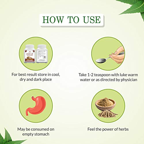Take 2-5gm (1-2 Teaspoon) of Axiom Ashwagandha Churna with lukewarm water or as directed by physicians.
