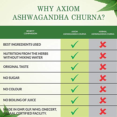 CERTIFICATION AND USES: Axiom Ashwagandha churna is 100% Natural WHO GMP, GLP certified, take 2-5gm (1-2 Teaspoon) of Axiom Ashwagandha Churna with luke warm water or as directed by physicians.
