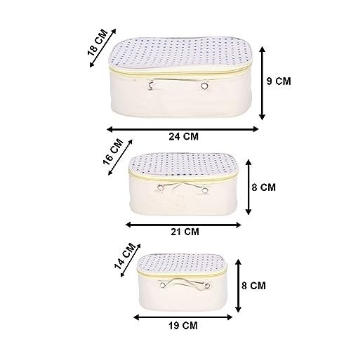 SET OF 3 Pouch Made of waterproof fabric, durable zipper heads, steady and durable for using. Upper mesh grid design inside, for your better organize and packing. Small size with large capacity, Put lipsticks, powder, sun screen, foundation, mascara and many more you want. Keep your travel toiletries well-organized when you are packing up for a trip. It can also freely store your electronics like charger, wire, earphone, etc including 5 Different Sizes Pouch. Interior made of soft and tailored with design Fabric standard quality with high finish stitches giving a high-end sense and smooth touch. 5 Colors available:- Peach, Dotted Cream, Yellow, Blue, Pink, Vanity cosmetic Toiletry Jewelry wardrobe Organizer regular makeup storage jewelry vanity box for women’s and girls’ make up kit about the products etc tailored with design Fabric standard quality with high finish stitches Dimensions of the 3 pcs are as follows Pack 1: 23 x 18 x 9 cm Pack 2: 21 x 16 x 8 cm Pack 3: 19 x 14 x 8 cm Very competitive rates zip closure, A wonderful cosmetic pouch for your love and travel friendly a perfect gift durable. Makeup Accessories Set|Makeup Products Set|Make Up Kit Bag.