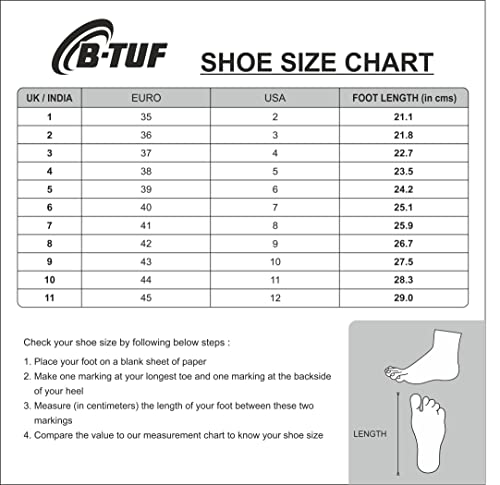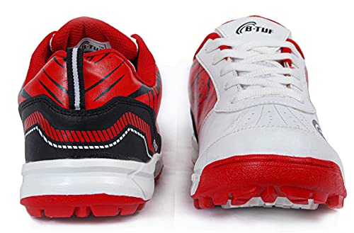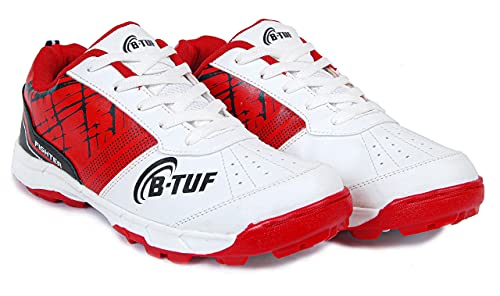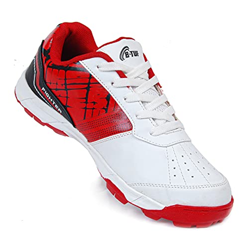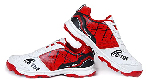 B-TUF FIGHTER Cricket/Sports Shoes are made up of Best quality Synthetic Leather upper with Advanced Durable and Flexible High-grade EVA midsole and superior PVC outsole studs, providing excellent traction/grip, slip resistance, and stability. B-TUF FIGHTER Cricket shoes are Lightweight, comfortable, and durable. The insole is made up of high-quality cushioning for better comfort. The toe/Front part of the Shoes and the Heel/back part of the sole are provided with better protection. Ventilation holes on the shoe upper are kept for airflow to keep players’ feet dry and cool. FIGHTER Cricket Stud Shoes can be used by Men, Women, Boys, Girls, and Kids.