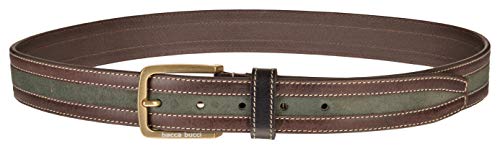 This belt is crafted with multiple coloured layers of leather. It has an olive shade suede leather like layer in the middle with a classic brown colour on either sides of the mid-section.