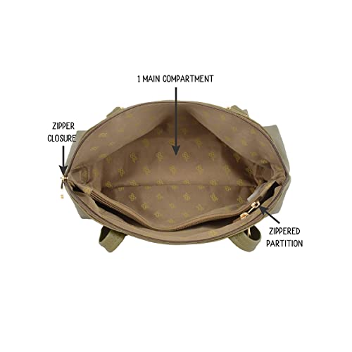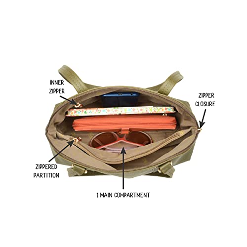 Olive exterior with 1 main compartment I 3 total number of pocket I Zipper closure I Cruelty-free premium material.