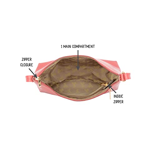 Coral exterior with 1 main compartment I 3 total number of pocket I Zipper closure I Cruelty-free premium material.