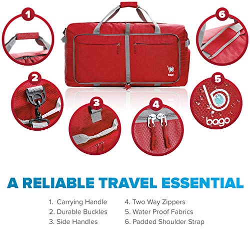 Prevent Emergency Luggage Situations and Save The Day With This Packable Travel and Sports Duffle For All Your Needs. Damaged suitcase in the middle of your trip? Tired of paying for overweight charges? Got carried away shopping for gifts and souvenirs? The Bago Packable Duffle Bag Has You Covered. Why get another bulky luggage when you can have the same packing space without the weight and bulk? Versatile and reliable, bring it anywhere as your “all-around” or “just-in-case” bag. Keep it inside your carry bag and use it for anything… Your gym bag, weekender bag, shopping bag, hospital bag, extra suitcase or “rescue bag” to avoid the overweight limit. A Travel and Home Essential Ensure stress free traveling! Ideal for the On-the-Go Lifestyle The Bago Travel Bags foldable duffle bag is designed for traveling and to carry and store sports gear, equipment or other items. Choose from a 60L bag and up to 100L bag to suit your packing, storage, and traveling needs. With several fashionable colors to choose from, this bag suits anyone in the family. Huge capacity to carry everything you want Durable and reliable for all your adventures and organizing needs Save money since it weighs 75% less than typical luggage Use for hauling sporting gear and equipment Ideal for camping or outdoor activities. XL Duffle Bag for garage or trunk storage. This bag is Super This Duffel bag is super Heavy Duty and can fold up small. It can easily fit up to 3 soccer balls.