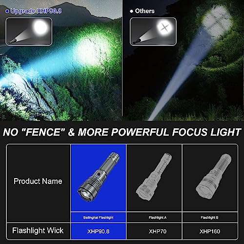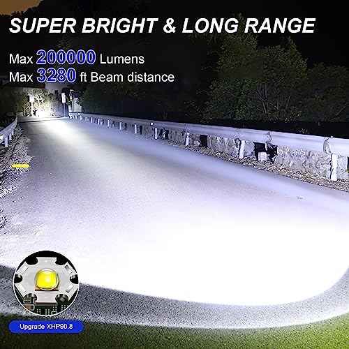 [200000 LUMENS SUPER BRIGHT FLASHLIGHT]–Bailinghai led rechargeable flashlight built-in advanced brightness of 200000 lumens XHP90.8 LED chip, and the ultra-bright flashlight with a lighting range of more than 3280 ft. This brightest flashlight is 30 times brighter than ordinary LED flashlights. Almost all field of vision around you can be turned into daylight, Rendering this bright flashlights more than suitable for camping outdoor recreational activities.