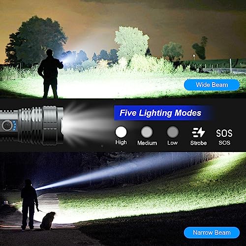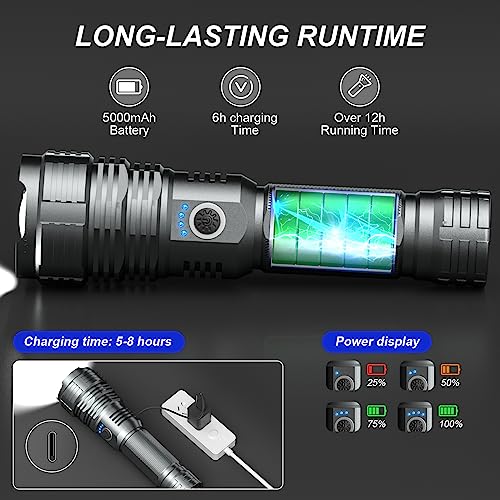 [5000 MAH HIGH CAPACITY BāTTERY & LONG LIFE]–This high powered flashlight is equipped with 50000 mAh high capacity rechargeable bā ttery, allows for an impressive 10 hours runtime while still maintaining optimal brightness. Flashlights high lumens battery powered built-in smart chip to prevent overcharge and overdischarge, make the flashlight life up to 200,000 hours, and the flash light can be recharged more than 150,000 times after testing.