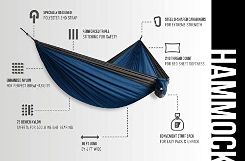 EVERYTHING YOU NEED – Our outdoor hammock and tree hammock comes with all the hardware: 2x 10 ft (others use 8 ft) high quality tactical grade rope suspensions specially formulated reinforced polyester end straps (holds a whopping 2000lbs) and a set of two solid steel d-shaped carabiners. This large backpacking hammock does not require a special stand stands or equipment to be set up. It works great in any setting whether outdoor or indoor or between two poles or two trees!