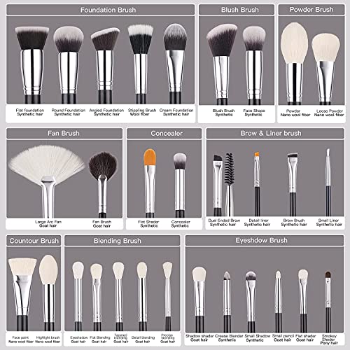 𝐀 𝐂𝐎𝐌𝐏𝐋𝐄𝐓𝐄 𝐁𝐄𝐀𝐔𝐓𝐘 𝐒𝐄𝐓 – The Upgraded set comes with 30 brushes, 11Pcs big face makeup brushes & 2Pcs fan brush & 17Pcs eye makeup brushes. The makeup brush set include singles, help you create any makeup on your eyes or face. 𝐏𝐫𝐞𝐦𝐢𝐮𝐦 𝐁𝐫𝐢𝐬𝐭𝐥𝐞𝐬 𝐌𝐚𝐤𝐞𝐮𝐩 𝐁𝐫𝐮𝐬𝐡𝐞𝐬 – We special choose Natural goat pony hair, Nano fiber and synthetic hair. Goat hair Touch skin-friendly, suitable for all skin types, softness like no other, They have excellent ability to grasp powder. Synthetic hair are soft and dense with different shape and sizes. High-tech Nano fiber Hair with Fine Soft Texture, super smooth touch, Good ability to grasp powder like animal hair, while they are easy to clean and quick dry. 𝐂𝐋𝐀𝐒𝐒𝐈𝐂 𝐃𝐄𝐒𝐈𝐆𝐍 – Black is always the classic color. Use durable natural birch handles and silver aluminum alloy ferrule in combination, offering a sense of luxury. Each handle uses SEVEN layers of unique spray paint, not only will not fade, but also has Non-slip. 𝐈𝐝𝐞𝐚𝐥 𝐅𝐨𝐫 𝐆𝐢𝐟𝐭 – Classic black makeup brushes set is the unique gift for mom, wife, women friends on any occasion such as birthday, Valentine’s Day, Anniversary, Mother’s Day, Christmas, Thanksgiving, etc.