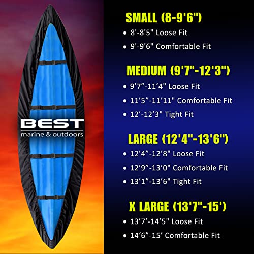 BUILT TO LAST – Our kayak cover is constructed of durable, water repellent 210D oxford polyester that is resistant to the sun’s UV rays. The adjustable drawstring bungee cord and 4 wrap around buckles allows our covers to fit most sized kayaks. Please reference the sizing chart in the images to select the correct size cover for your kayak