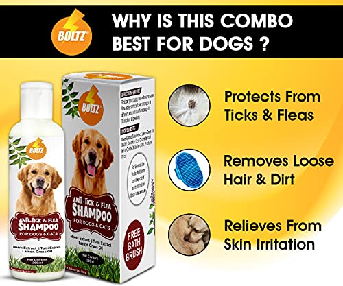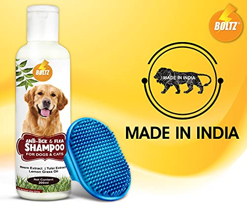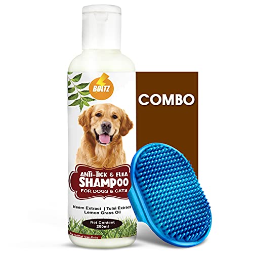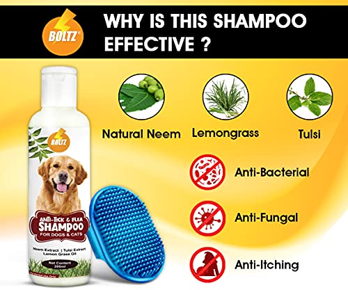 Boltz Anti Tick & Flea Dog Shampoo with Neem,Lemongrass & Tulsi-200 ml with Bath Brush Free (Brush Colour May Vary) Pack Of 1