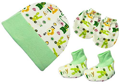 BRANDONN Newborn Baby’s Cotton Mitten, Bootie & Cap Set 0-4 Months Baby Boys and Baby Girls, Pack of 4